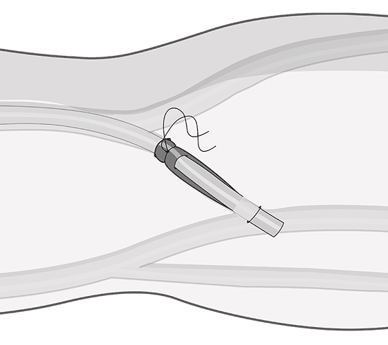 y una vez alcanzada la luz de la vena se introducirá el alambre guía flexible hasta ubicarlo en el centro de la vena