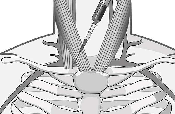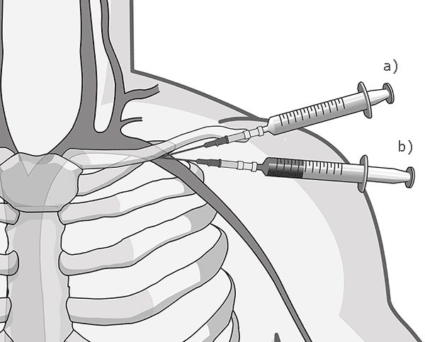 e) Acceso: como hemos señalado en la cateterización de la vena subclavia, una aguja exploradora de 18 a 20 G y de 5 cm de largo adosada a una jeringa de 5 cc deberán ser utilizadas antes de intentar la cateterización con una aguja de grueso calibre (14 G).