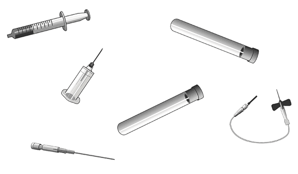 f) Sistemas de colección sanguínea: existen varios sistemas de colección de muestras. Se puede utilizar el sistema Vacutainer, consistente en un accesorio plástico descartable con una aguja en cada extremo que va a permitir, por un extremo, efectuar la punción venosa y con el otro extremo se perforará la tapa del tubo colector al vacío y estéril.