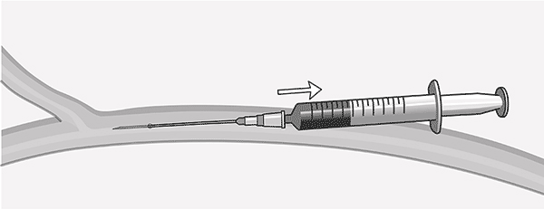 l) En ambos accesos es preciso ejercer una suave aspiración con el émbolo de la jeringa. El retorno de sangre nos indica que hemos penetrado la luz de la vena. Se avanzarán 2-3 mm más con la aguja para estar seguros de estar centrados en la luz de la vena.